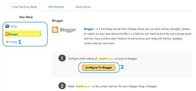 بأمكانك ربط الدومين اما بـ Tumblr أو Blogger أو Weebly وكلها مواقع تختص بانشاء مدونات مجانية او صفحة خاصة بك مجانا ما يهمنا هنا هو ربط الدومين بمدونة بلوج ..